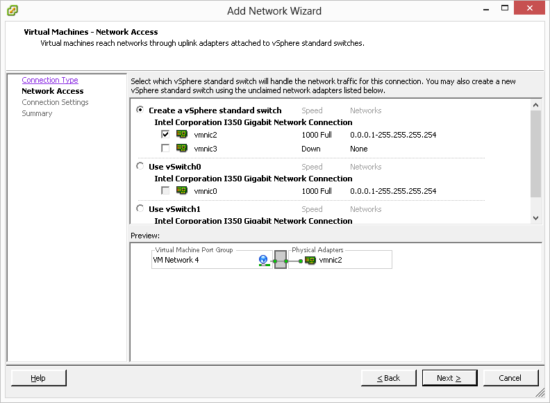 Selecione uma das placas de redes físicas que o seu ESXi dispõe e dê Next